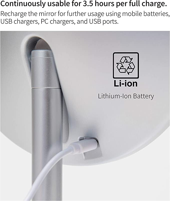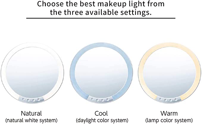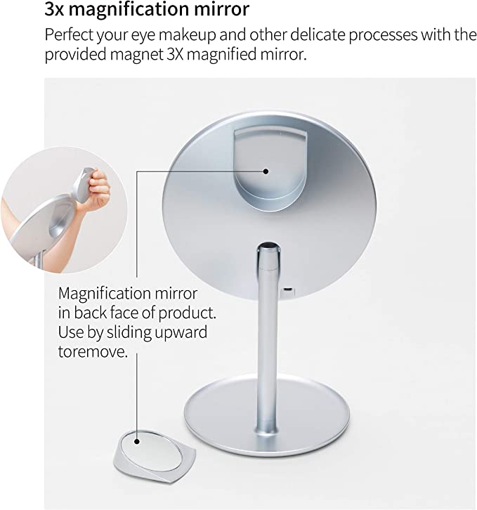 HORIUCHI MIRRORは、くすみの原因となる鉄分をより多く取り除いた透明度の高いガラスと、色の再現性が高い反射金属との組み合わせにより、本来の姿をありのままに映し出す日本で特許を取得した鏡です。肌の色が鮮明に映ることで、自分に合ったファンデーションの色味がわかり、メイクの仕上がりが格段よくなるため、美容業界のプロの方々にも支持されています。 LEDスタンドミラーは、天候やその場の照明に影響を受けないメイク専用のスタンドミラーです。 特徴1 お出かけシーンにあわせてメイクアップができるように3種類(ナチュラル・クール・ウォーム)のライトを選べます。 特徴2 それぞれの使用場所の明るさにあわせて8段階の明るさ調整が可能です。 特徴3 本体裏面にはアイメイクなど細かい作業に最適な3倍拡大鏡が収納されていて取り外してご利用いただけます。 特徴4 ミラー面は最大120度まで傾けることができるので、見やすい角度に調整できます。 特徴5 電源は充電式のリチウムイオン電池が内蔵されていますので電池などはいりません。モバイルバッテリーやUSB電源アダプター、パソコンなどのUSBポートで充電でき、フル充電で約3時間半ご使用可能です。 サイズ 20×16.5×33cm ミラーサイズ 16.8cm丸 重量 約520g 素材 ABS樹脂・ポリカボネード・ガラスミラー 日本製