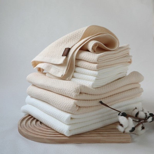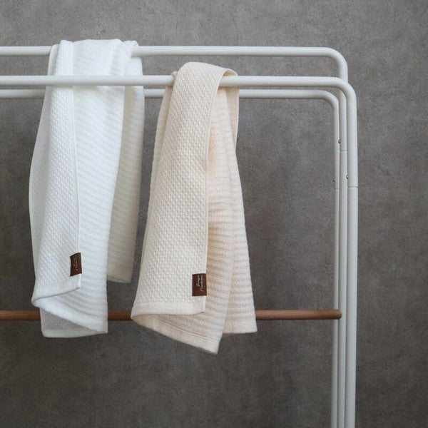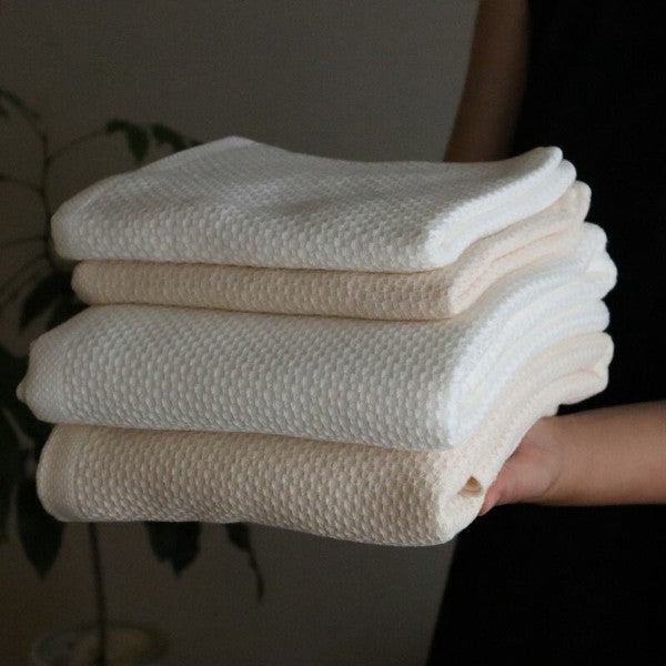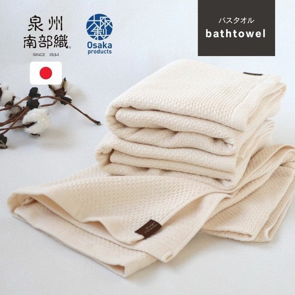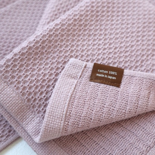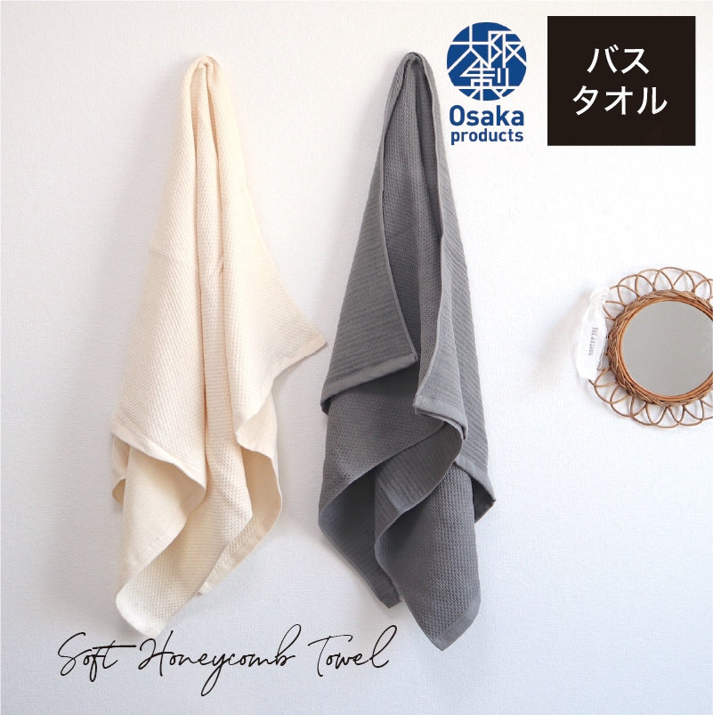 表に六角形のデコボコ(ハニカム織)と裏に粗めのガーゼを織り合わせることで、薄手ながらも柔らかく優しい肌触りが特徴です。 2層構造でふかふかと柔らかく、通気性に優れているので乾きが早くいつでも清潔にお使いいただけます。 大阪製認定商品。