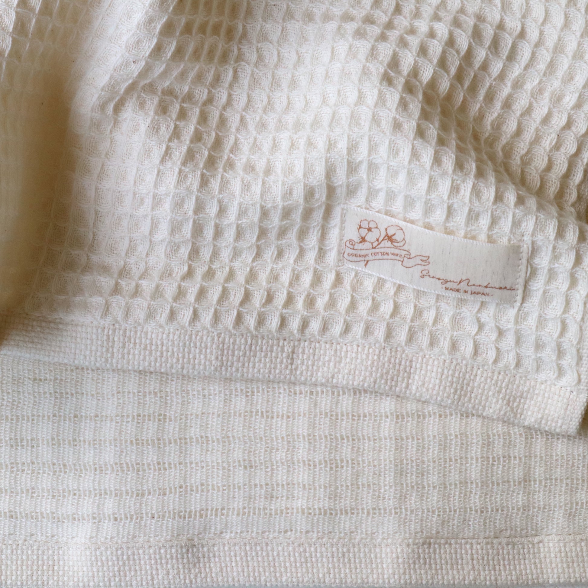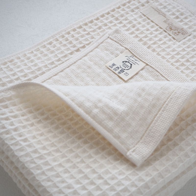 経糸にも緯糸にもオーガニックコットンを使用したふんわりと柔らかいタオル。表地は四角形のデコボコ(ワッフル織)、裏地は粗目のガーゼを織り合わせることで薄手でありながらトロンと柔らかく肌に優しいタオルです。後晒の際にも化学薬品を一切使用しない酵素の力で汚れを落とす製法を採用し、環境にも人にも優しいタオルです。コットン本来の風合いを感じていただきたいので、染色をせず生成り色をお楽しみください。