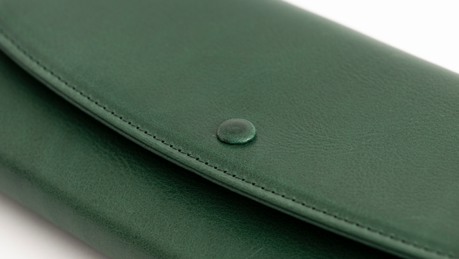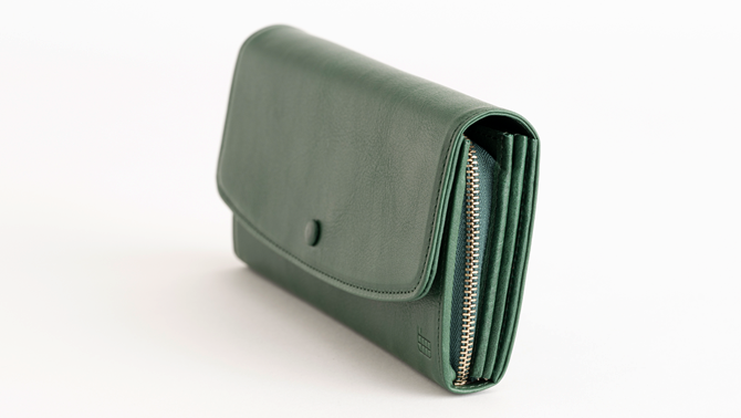 留め具を革で包んだクルミボタンが特徴的な長財布。