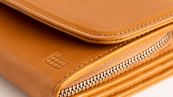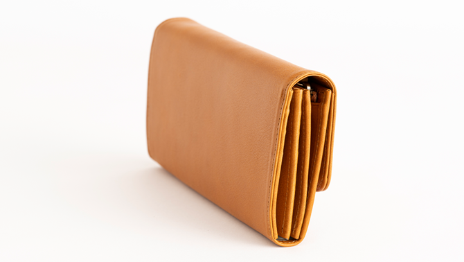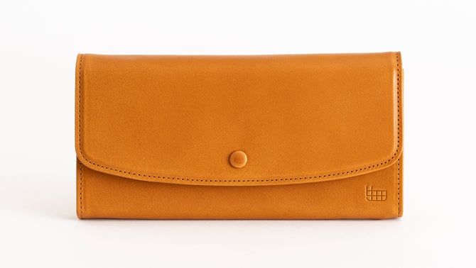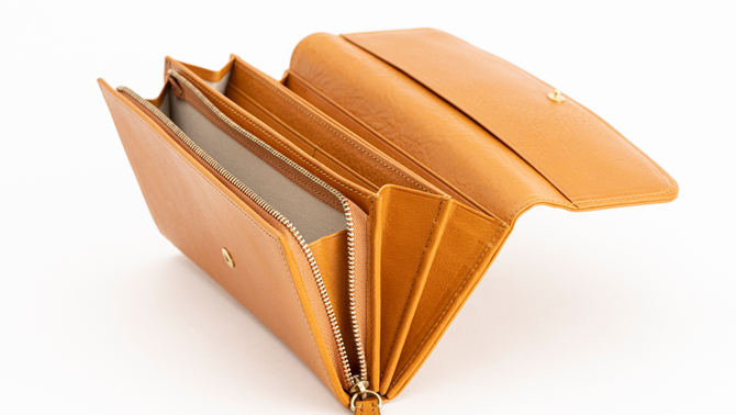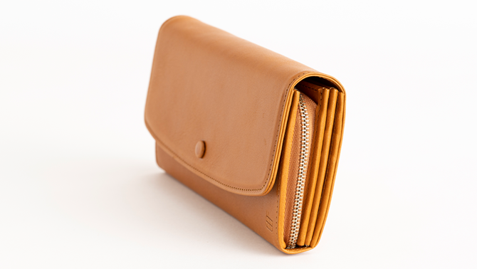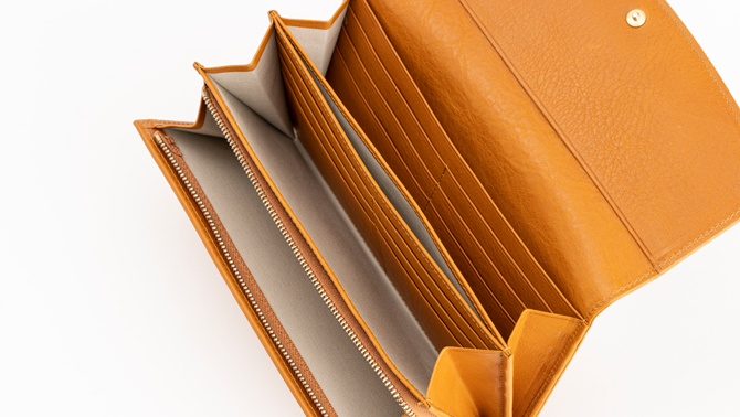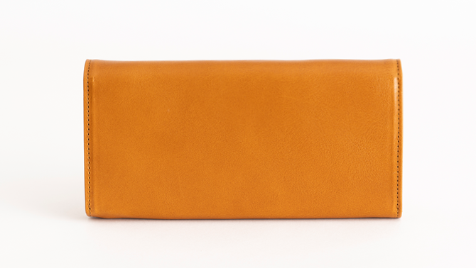 留め具を革で包んだクルミボタンが特徴的な長財布。