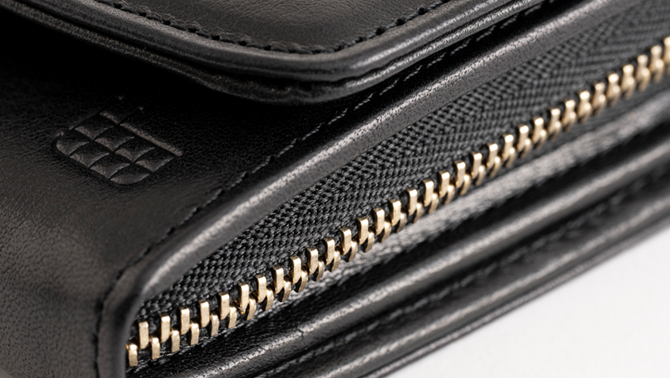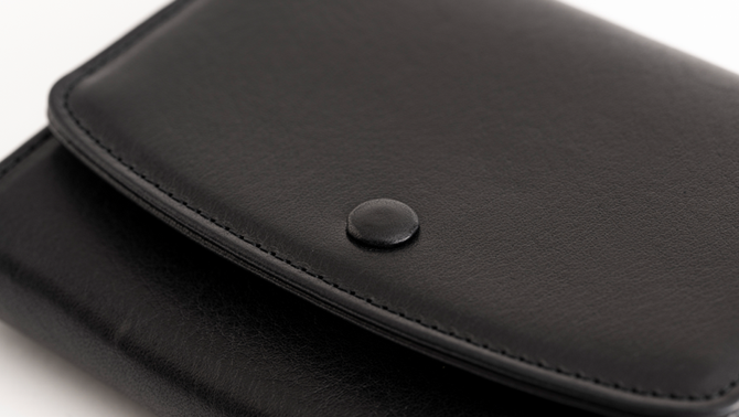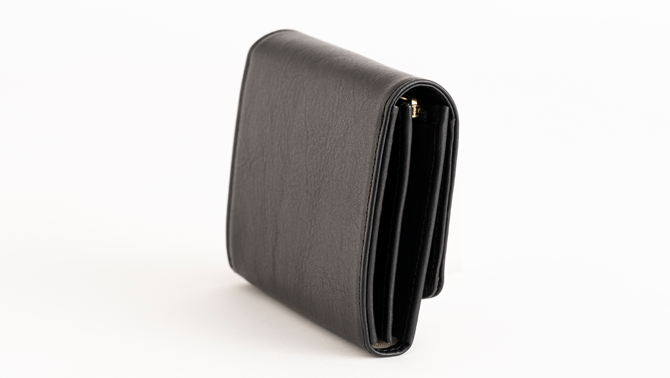 留め具を革で包んだクルミボタンが特徴的な財布。